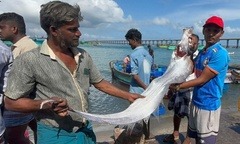 Khi đang phân loại chiến lợi phẩm, ngư dân bất ngờ phát hiện một con cá mái chèo lấp lánh mắc kẹt trong lưới, một vật phẩm quý hiếm dài và nặng khoảng 6 kg.
