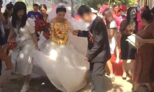 Cô dâu ở Trung Quốc gây "choáng váng" mạng xã hội khi xuất hiện trong đám cưới với tổng cộng 60 kg vòng vàng đeo trĩu cổ.